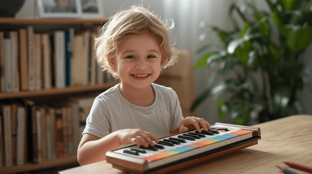A mini musical keyboard is perfect for this stage — lightweight, compact, and fun to play.